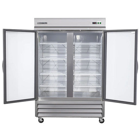 The Maxx Cold MXSR-49GDHC is a durable commercial reach-in refrigerator with a stainless steel exterior and painted aluminum interior, designed for the demands of professional kitchens. It features two heavy-duty self-closing glass doors with curved handles, providing easy visibility of contents. The refrigerator utilizes extra-thick, environmentally-safe CFC-free polyurethane foam insulation to maintain optimal temperature control between 33°F to 41°F (1°C to 5°C). Temperature is precisely regulated by password-protected, solid-state digital controls with a display showing internal temperatures in Fahrenheit or Celsius. An automatic defrost system prevents icing, ensuring peak operating condition. With 42.9 cubic feet of storage capacity, the interior is efficiently organized with six corrosion-resistant, poly-coated shelves, while interior lighting with a manual switch illuminates contents. This durable and versatile reach-in refrigerator from Maxx Cold offers commercial-grade temperature management and storage in a sleek, easy-to-clean stainless steel design.