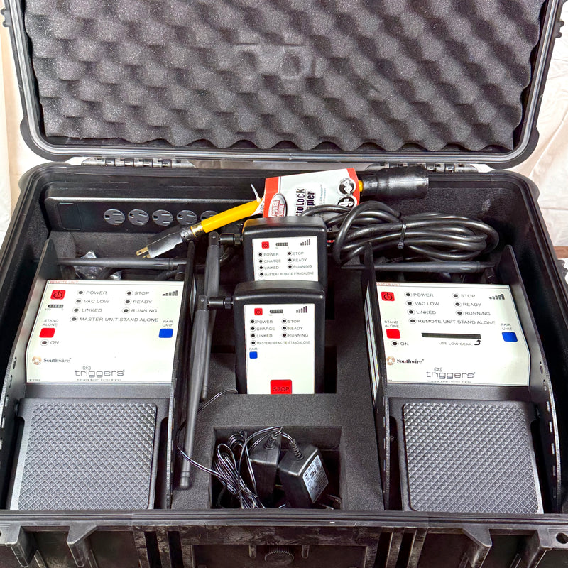 Wireless dual remote foot pedal system designed for power control and safety during cable pulling and feeding applications. Allows crew members at each end of the pull and observers to stop operations instantaneously. Compatible with all brands of electrically driven equipment.