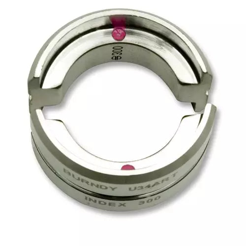 The Burndy U34ART Stainless Steel U Die Set features a 12-ton crimp force capacity and works with 500 kcmil (MCM) aluminum wire. It is color-keyed PINK and die coded 300 for easy identification. The die set is used with PAT750 series, PAT46 series, Y35, Y39, Y750 and Y46 crimping tools. The PUADP1 die adapter (109X085) is required for use with the Y46 crimper.