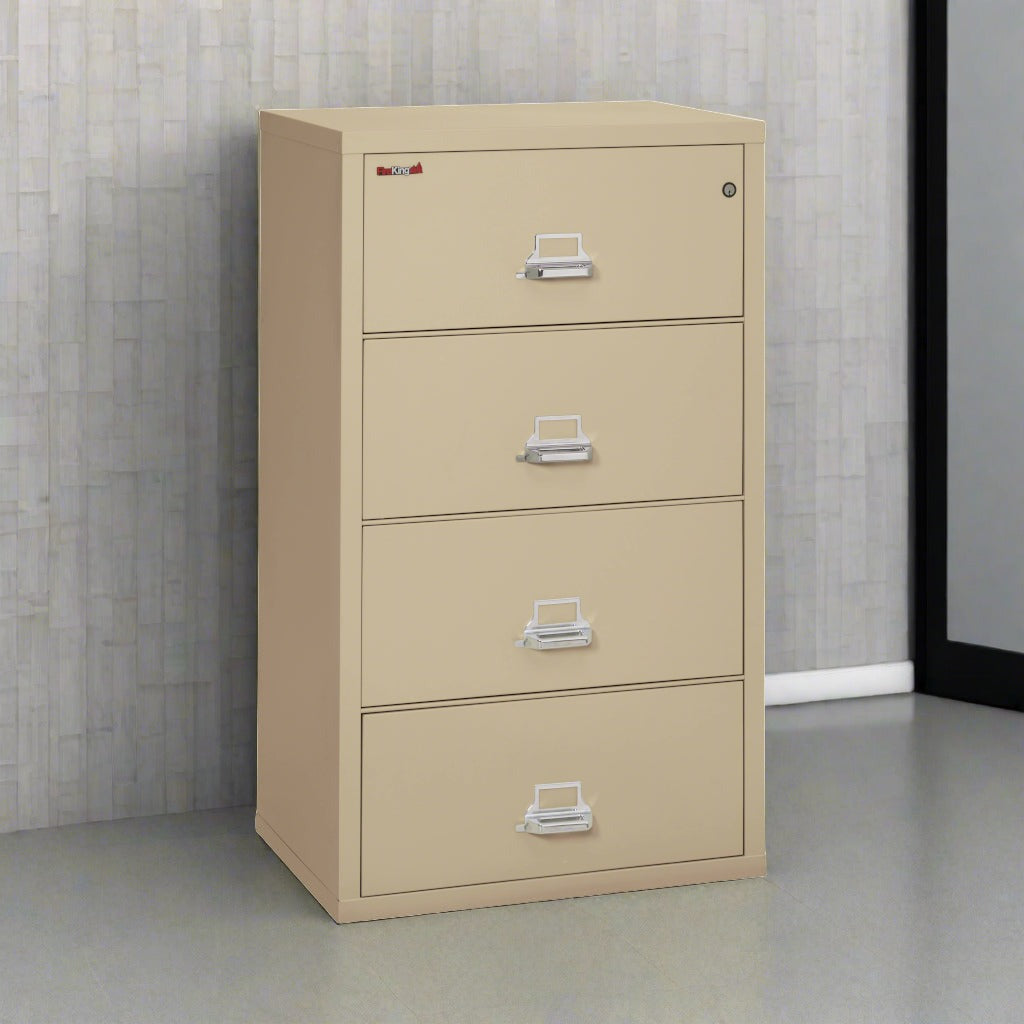 Safeguard your crucial documents and media with the FireKing Classic 1-Hour Fire-Rated Lateral File Cabinet, the essential choice for elite protection against fire, impact, and explosion. Constructed with 100% gypsum insulation reinforced by 14-gauge galvanized welded steel wire lattice, and featuring field-replaceable steel panels, this cabinet offers unmatched fire-resistant security. Its environmentally-friendly scratch-resistant powder coating ensures lasting durability, while high-side drawer bodies accommodate hanging folders effortlessly and maintenance-free suspensions provide smooth operation. Maximum security is assured with UL-listed Medeco key locks, insulated fire-resistant drawer heads and surface-mounted pulls. Proven resilient with the 1-Hour Class 350 Fire with Impact UL label after rigorous testing, and designed to prevent water damage, the FireKing lateral file cabinet provides the definitive solution for protecting your vital documents and items from fire's devastating effects.