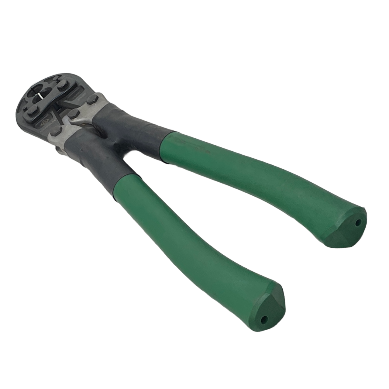 The K425O Mechanical Crimping Tools are hand-operated tools that use permanent die grooves and/or insertable W-type dies. These tools have two permanent die grooves for distribution tap connectors. The die inserts snap into a permanent groove easily with one hand and are secured with the spring-loaded, positive lock, die retaining buttons.