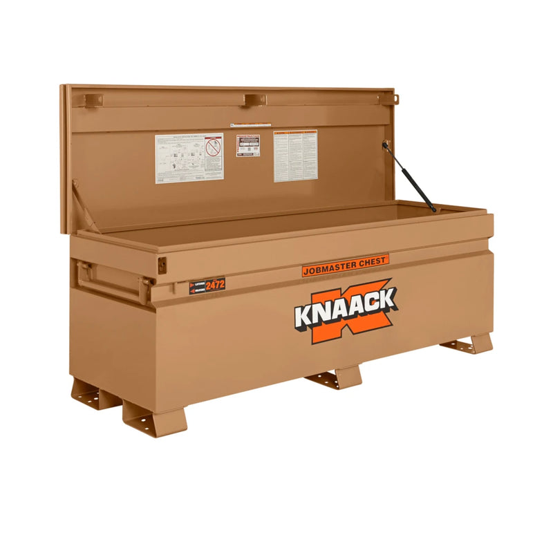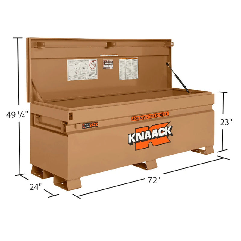 The Knaack 2472 JOBMASTER Chest is a durable, high-capacity tool chest designed for secure jobsite storage. With a 24.5 cu. ft. capacity, this chest measures 72 inches wide by 24 inches deep, providing ample space for tools and equipment. Its WATCHMAN IV Lock System offers superior theft prevention with a 3-point latch and reinforced lock housing. The full-length piano hinge ensures enhanced security, while the ergonomic lid with a dampening spring allows for smooth operation. Built with heavy-duty 16-gauge steel, fully arc-welded seams, and a powder-coat finish, this chest is designed for long-term durability. It features a POWER PASS Electrical Pass-Thru grommet for weatherproof cord access and 4-way pre-punched skids for easy transport and optional caster installation.