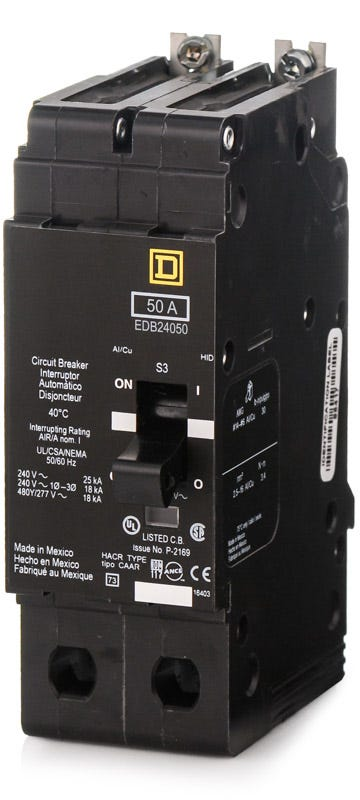 Schneider Electric / Square D Bolt-On Circuit Breaker Its Compact And Easy to Install Double pole thermal-magnetic circuit breaker has a current rating of 50 Amps at 40 deg c and voltage rating of 120/240/277 Vac it has an interrupt current rating of 25 Kiloampere At 120/240 Vac it accommodates aluminum/copper wire of size 14 to 2/0 Awg miniature circuit breaker has mounting bolts to hold the breaker in place circuit breaker is Ul listed and Csa certified.